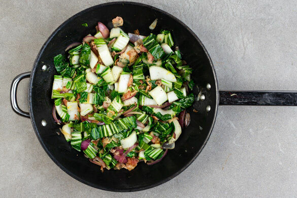 Den weißen Teil des Pak Choi in ca. 0,5cm breite, den grünen Teil in ca. 1cm breite Stücke schneiden. Den Bacon in 0,5–1cm breite Streifen schneiden.