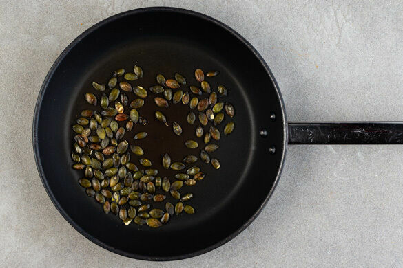 Die Kürbiskerne in einer mittelgroßen Pfanne ohne Zugabe von Fett unter ständigem Rühren Fett 3–4Min. anrösten. Aus der Pfanne nehmen und beiseitestellen, die Pfanne aufbewahren.