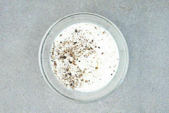 Den Backofen auf 220°C (200°C Umluft) vorheizen. Die Crème fraîche glatt rühren und mit je 1 kräftigen Prise Salz und Pfeffer würzen.
