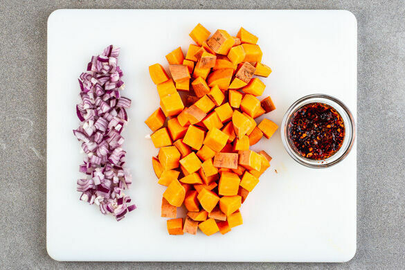 Den Backofen auf 240°C (220°C Umluft) vorheizen. Die Chiliflocken in heißem Wasser einweichen. Die Süßkartoffeln samt Schale in ca. 1,5cm große Würfel schneiden. Die Zwiebeln schälen, halbieren und fein würfeln. Tipp: Ggf. weniger Chiliflocken verwenden, um die Schärfe zu reduzieren.