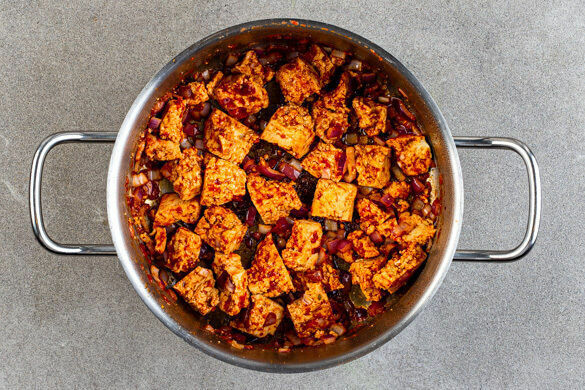 Den Tofu mit den Fingern in mundgerechte Stücke zerkrümeln, dann mit der ½ der Sojasauce und der restlichen Gewürzmischung vermengen. In einem großen Topf 2EL Pflanzenöl erhitzen, den Tofu und ⅔ der Zwiebeln ins heiße Öl geben und bei mittlerer Hitze ca. 5Min. braten, bis die Zwiebeln weich und leicht gebräunt sind. Regelmäßig umrühren.
