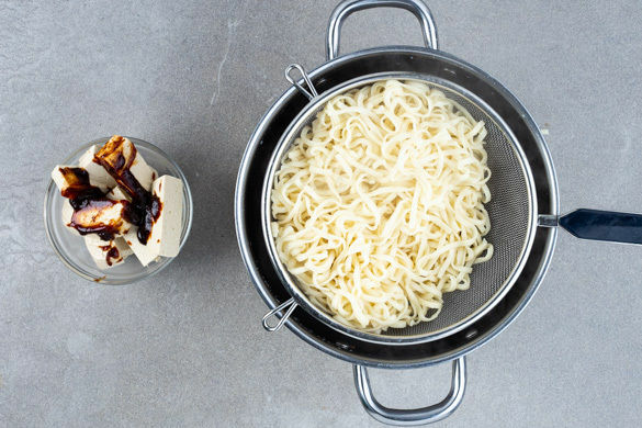 In einem mittelgroßen Topf ausreichend gesalzenes Wasser für die Nudeln zum Kochen bringen. Die Nudeln in das kochende Wasser geben und in 3–5Min. bissfest kochen. In ein Sieb abgießen und kalt abschrecken. Den Tofu trocken tupfen und horizontal halbieren, dann in insgesamt 8 ca. 2cm breite Scheiben schneiden und mit der 1/2 der Hoisinsauce vermengen.