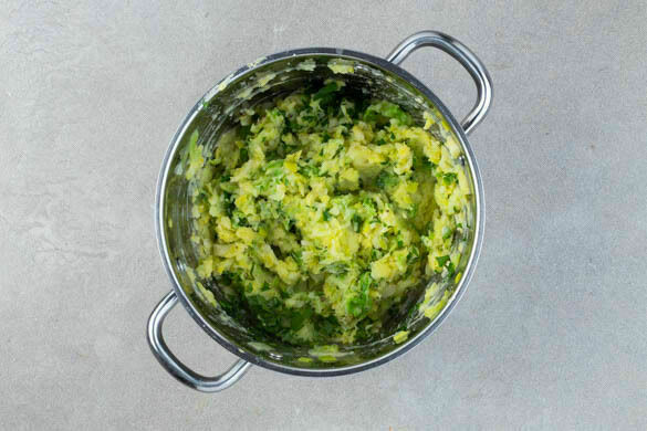 Die Kartoffeln, den Wirsing und den Lauch in einem großen Topf mit ausreichend gesalzenem Wasser bedecken. Das Wasser zum Kochen bringen und das Gemüse in 12–15Min. bissfest kochen. Mit einer Tasse etwas Kochwasser abschöpfen, dann das Gemüse in ein Sieb abgießen und abtropfen lassen.
