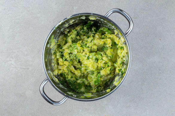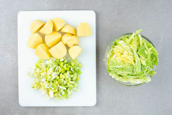 Die Kartoffeln, den Wirsing und den Lauch in einem großen Topf mit ausreichend gesalzenem Wasser bedecken. Das Wasser zum Kochen bringen und das Gemüse in 12–15Min. bissfest kochen. Mit einer Tasse etwas Kochwasser abschöpfen, dann das Gemüse in ein Sieb abgießen und abtropfen lassen.