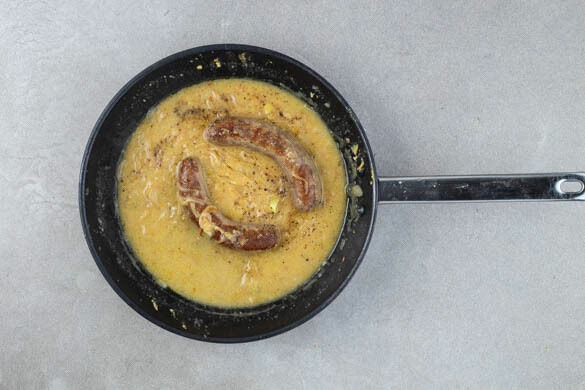 Die Zwiebelringe mit 1TL Mehl bestäuben und unter Rühren ca. 1Min. braten. 250ml warmes Wasser zufügen und die ½ des Brühgewürzes, 1EL Senf sowie 1 Prise Pfeffer einrühren. Bei mittlerer Hitze 4–5Min. köcheln lassen, bis die Sauce eingedickt ist und die Würste gar sind.