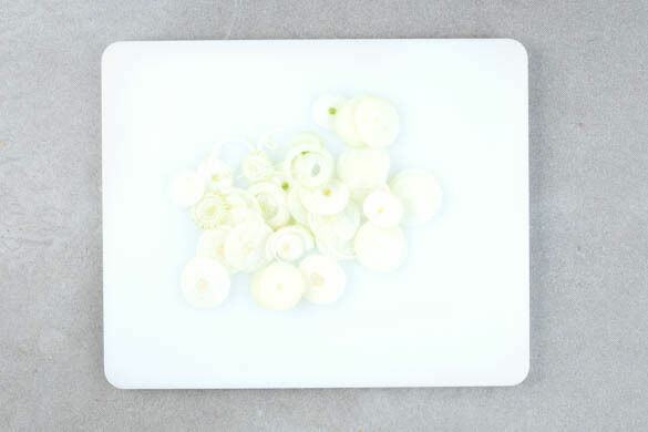 Die Zwiebel schälen und in dünne Ringe schneiden.