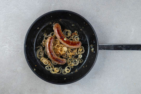 Die Würste und die Zwiebelringe in einer mittelgroßen Pfanne mit 1EL Pflanzenöl bei starker Hitze 3–4Min. anbraten, dabei gelegentlich wenden.