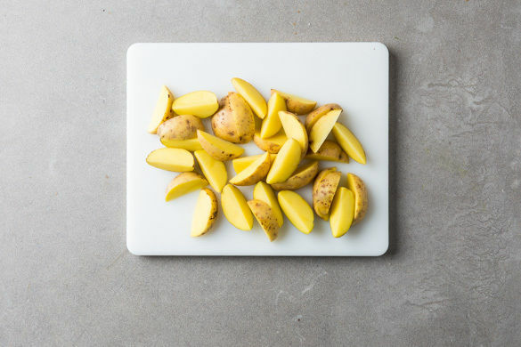 Den Backofen auf 220°C (200°C Umluft) vorheizen. Die Kartoffeln samt Schale in ca. 2cm breite Spalten schneiden oder der Länge nach vierteln.