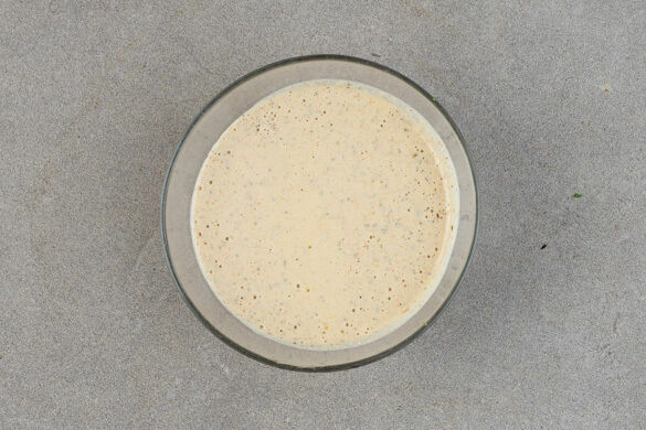 Die Walnüsse in einer kleinen Pfanne ohne Zugabe von Fett bei mittlerer Hitze 1–2Min. anrösten. Zum Abkühlen aus der Pfanne nehmen und beiseitestellen. Die ½ der Walnüsse mit dem Knoblauch, der ½ des Fetas, der Gewürzmischung, 1EL Zitronensaft, 2EL Olivenöl, 3EL Wasser und 1 kräftigen Prise Salz in einem hohen Gefäß mit einem Stabmixer fein pürieren.