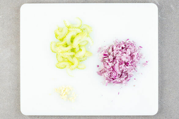 Den Backofen auf 190°C Umluft (210°C Ober-/Unterhitze) vorheizen. Den Sellerie in dünne Scheiben schneiden. Die Zwiebel und den Knoblauch schälen und fein würfeln.