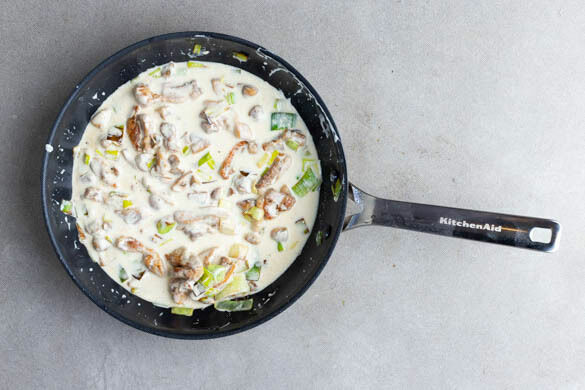 Die Pilze in derselben Pfanne mit 1EL Olivenöl bei mittlerer Hitze 3–5Min. anbraten. Den Lauch hinzufügen und 1–2Min. mitbraten. 1EL Mehl, dann die Crème fraîche und 250ml Pastawasser unterrühren und das Brühgewürz in der Sauce auflösen. Das Fleisch hinzugeben und 1–2Min. in der Sauce köcheln lassen. Nach Belieben das übrige Pastawasser unterrühren.