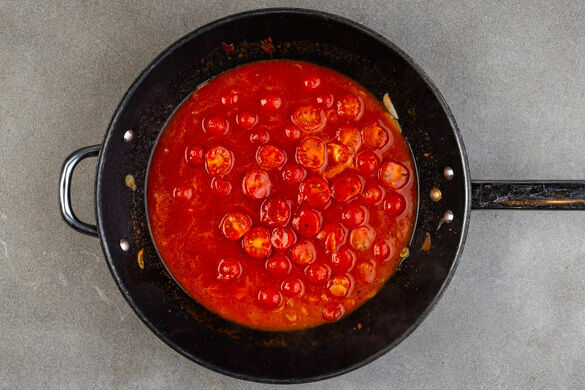 Die weißen Lauchzwiebelringe und den Knoblauch in einer mittelgroßen Pfanne mit 1EL Butter bei mittlerer Hitze 1–2Min. farblos anbraten. Die Kirschtomaten dazugeben und durchschwenken, dann das Tomatenmark unterrühren. Mit 200ml Wasser ablöschen und die Sauce ca. 2Min. sanft köcheln lassen. Mit 1TL Honig sowie Salz und Pfeffer nach Geschmack würzen.