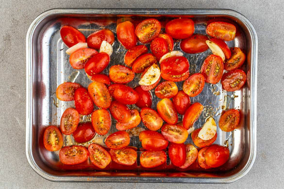 Den Backofen auf 200°C (180°C Umluft) vorheizen. Die Kirschtomaten halbieren. Den Knoblauch schälen und in feine Scheibchen schneiden. Die Tomaten in eine Auflaufform geben, mit der Gewürzmischung, dem Knoblauch, 2EL Olivenöl sowie je 1 kräftigen Prise Salz und Pfeffer vermengen und beiseitestellen.