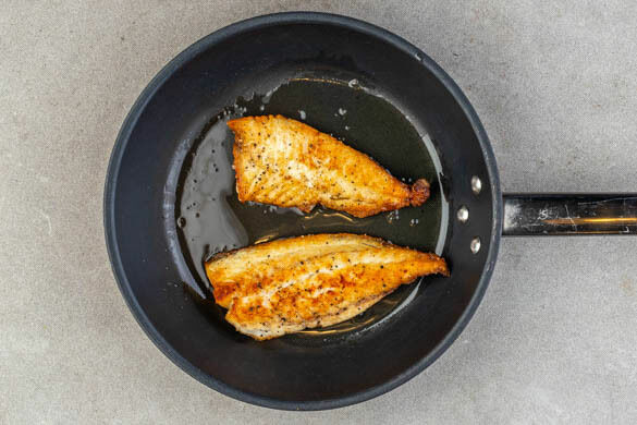 Den Fisch trocken tupfen und von beiden Seiten mit je 1 Prise Salz und Pfeffer würzen. Auf der Hautseite in einer zweiten Pfanne mit 2TL Olivenöl bei mittlerer Hitze 2–4Min. knusprig braten. Den Fisch vorsichtig wenden und noch 2–3Min. weiterbraten, bis der Fisch gar ist.