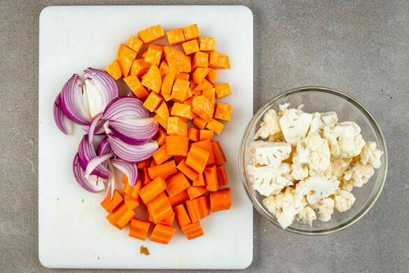 Den Backofen auf 220°C (180° Umluft) vorheizen. Die Blumenkohle in ca. 2cm große Röschen schneiden, den Strunk ggf. schälen und grob würfeln. Die Süßkartoffeln und die Karotten ggf. schälen und in ca. 2cm große Würfel schneiden. Die Zwiebeln schälen, halbieren und in Spalten schneiden.