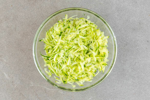 Den Backofen Ober-/Unterhitze auf 250°C vorheizen. Tipp: Falls vorhanden, die Grillfunktion zuschalten. Die Zucchini mit einer Küchenreibe grob raspeln, mit 2 kräftigen Prisen Salz vermischen und ca. 5Min. ziehen lassen.
