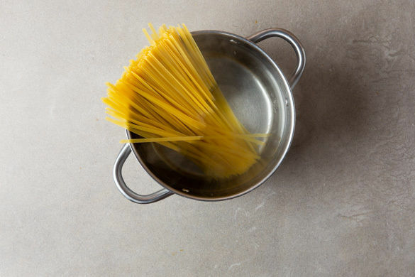 Die Pasta in das kochende Wasser geben und in 7–9Min. bissfest kochen. Mit einer Tasse etwas Kochwasser abschöpfen, dann die Pasta in ein Sieb abgießen. Die abgetropfte Pasta zurück in den Topf geben und mit 1EL Olivenöl vermengen.