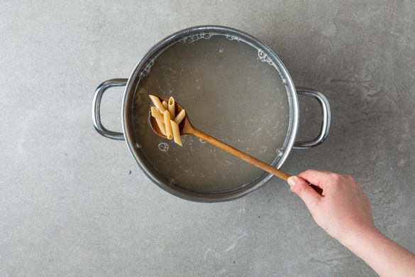 Die Pasta in das kochende Wasser geben und in 8–10Min. bissfest kochen. Mit einer Tasse etwas Pastawasser abschöpfen, dann die Pasta in ein Sieb abgießen und abtropfen lassen.
