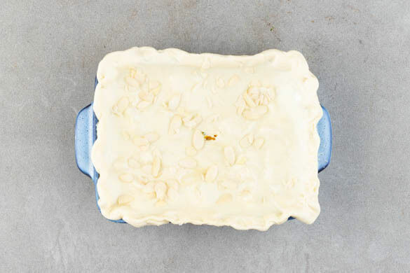 Die Füllung auf zwei mittelgroße Auflaufformen verteilen. Jeweils das Backpapier abziehen, die Teige über den Auflaufformen ausrollen und in der Mitte x-förmig einritzen. Mit dem übrigen Ei bestreichen und mit den restlichen Mandeln bestreuen. Im Ofen 16–18Min. backen, bis der Teig goldbraun ist. Nach Belieben mit Zimt bestreuen.