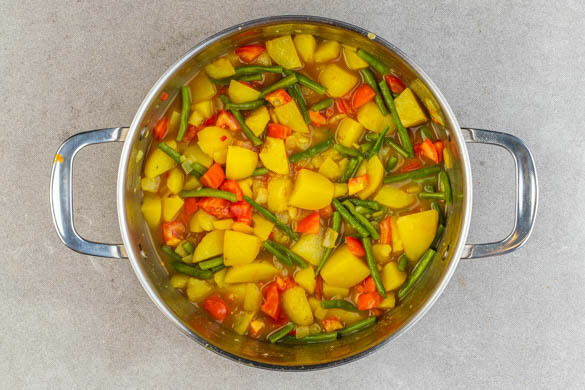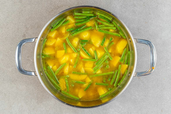 Die Bohnen und die Kartoffeln hinzufügen und mit 500ml heißem Wasser ablöschen. Ggf. etwas mehr Wasser hinzufügen, damit das Gemüse vollständig bedeckt ist. Das Brühgewürz einrühren und Suppe abgedeckt zum Kochen bringen. Sobald die Suppe kocht, die Hitze reduzieren und die Suppe ca. 12Min. sanft köcheln lassen, bis die Kartoffeln fast gar sind.