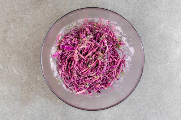 Den Rotkohl kräftig mit der Koriandercreme verkneten. Mit Salz und Pfeffer abschmecken.