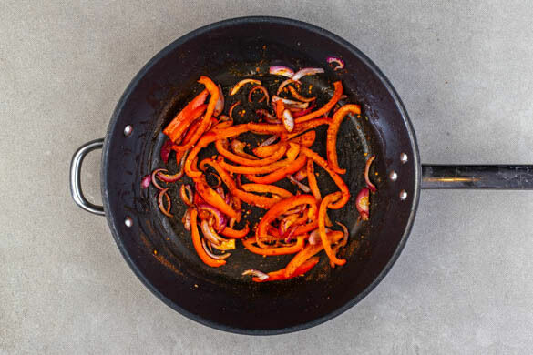 Die Zwiebel schälen, halbieren und in feine Streifen schneiden. Die Paprika vierteln, entkernen und in dünne Streifen schneiden. Die Zwiebeln und die Paprika mit 1 kräftigen Prise Salz in einer mittelgroßen Pfanne mit ½EL Pflanzenöl bei mittlerer Hitze 6–8Min. braten, bis sie weich werden. Die Gewürzmischung unterrühren und die Pfanne vom Herd nehmen.