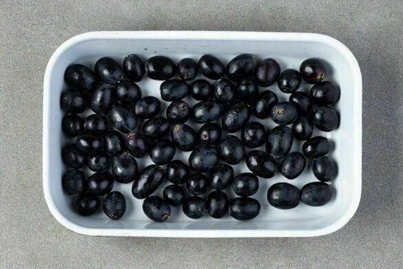 Den Backofen mit Grillfunktion oder Ober-/Unterhitze auf 250°C vorheizen. In einem großen Topf ausreichend Wasser für die Pasta zum Kochen bringen und das Brühgewürz einrühren. Die Weintrauben abzupfen und in eine ausreichend große Auflaufform geben.