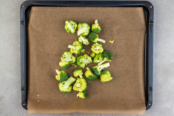 Den Brokkoli auf ein mit Backpapier ausgelegtes Backblech geben und mit 2EL Pflanzenöl, dem restlichen Ingwer und 1 kräftigen Prise Salz schwenken und 10Min. im Ofen backen.