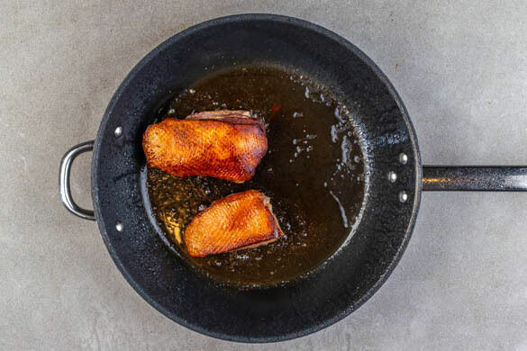 In einem mittelgroßen Topf 800ml leicht gesalzenes Wasser für den Reis zum Kochen bringen. Das Fleisch trocken tupfen und mit der Fettseite nach unten in eine mittelgroße Pfanne legen und bei mittlerer bis starker Hitze 10–11Min. das Fett austreten lassen. Das Fleisch umdrehen und 7–8Min. braten, bis es gart.