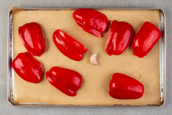 Die Paprika jeweils vierteln und entkernen und mit der Schnittfläche nach unten auf ein mit Backpapier ausgelegtes Backblech geben. Den ungeschälten Knoblauch dazulegen und das Gemüse auf der obersten Schiene 8–10Min. grillen, bis die Paprikahaut Blasen wirft.