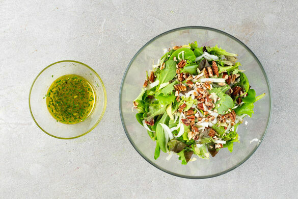 Den Chicorée längs halbieren und quer in dünne Streifen schneiden. Die Pekannüsse fein hacken. Kurz vor dem Servieren den Salat mit dem Chicorée, den Nüssen und dem Dressing vermengen. Den Flammkuchen nach Belieben in Stücke schneiden, auf Teller verteilen und mit dem Salat servieren.