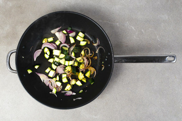 Die Zucchini in einer mittelgroßen Pfanne mit 1EL Olivenöl bei mittlerer Hitze 2–3Min. anbraten. Die Zwiebelstreifen und den Knoblauch dazugeben, mit dem Currypulver und Salz nach Geschmack würzen und alles weitere 2Min. braten. Das Paprika-Linsen-Gemüse mit dem Fleisch und dem Zucchinigemüse anrichten und mit den Petersilienblättern garniert servieren.