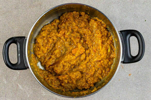 In einem kleinen Topf den Orangensaft mit der restlichen Gewürzmischung, 2EL hellem Essig, ½TL Salz und 2EL braunem Zucker aufkochen, dabei stetig rühren. Die restlichen Zwiebeln, den Knoblauch und die Kaki hinzugeben und bei niedriger Hitze 8–10Min. köcheln, bis die Flüssigkeit um die Hälfte eingekocht ist.