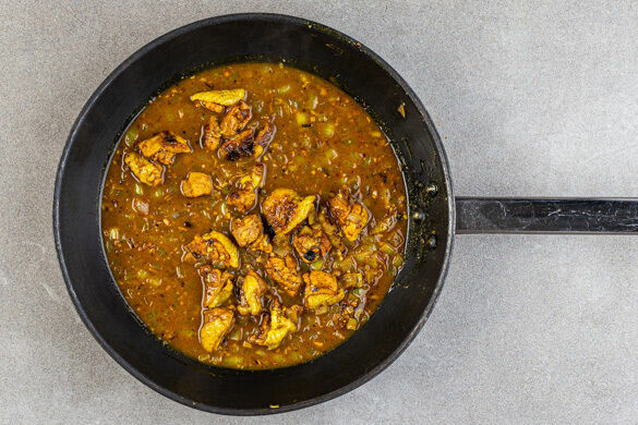 Das Fleisch mit 200–250ml Wasser ablöschen, die ½ des Brühgewürzes unterrühren und die Sauce 8–10Min. sanft köcheln lassen. Den Käse fein reiben.