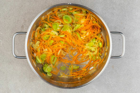 Den Gemüsemix in dem aufbewahrten Topf mit 3EL Olivenöl bei mittlerer bis starker Hitze 6–8Min. braten. Den Knoblauch schälen und sehr fein würfeln oder durch eine Knoblauchpresse drücken.
