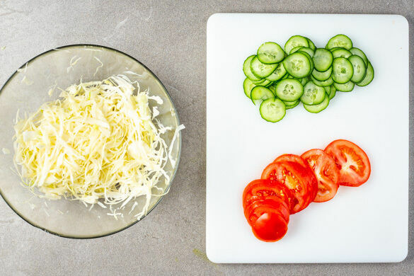 Den Weißkohl mit 1EL Reisessig und 1 kräftigen Prise Salz ca. 2Min. mit den Händen gut durchkneten, bis der Kohl weich ist. Die Tomate und die Gurke in dünne Scheiben schneiden.