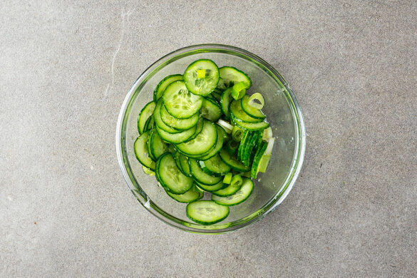 Das Toastbrot im Toaster oder im Ofen goldbraun toasten. Die Lauchzwiebel in feine Ringe schneiden. Den restlichen Reisessig mit 1TL (braunem) Zucker sowie je 1 Prise Salz und Pfeffer verrühren und mit den Lauchzwiebeln und den Gurken zu einem Salat vermengen.