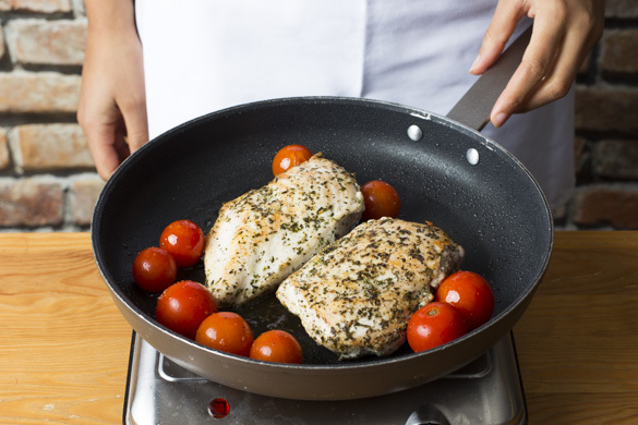 Das Fleisch trocken tupfen und längs halbieren. Die ½ der Gewürzmischung mit 1EL Olivenöl verrühren und das Fleisch rundum mit dem Würzöl einreiben, dann in einer mittelgroßen, ofenfesten Pfanne bei starker Hitze auf jeder Seite 1–2Min. scharf anbraten. Die Kirschtomaten dazugeben und das Fleisch und die Tomaten 7–9Min. im Ofen garen, bis das Fleisch durch ist.