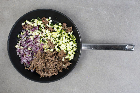 Das Hackfleisch in einer großen Pfanne mit 1EL Olivenöl bei starker Hitze 3–4Min. anbraten. Die Zucchini, die restlichen Zwiebeln und den restlichen Knoblauch hinzugeben und 3–4Min. mitbraten. Mit Salz und Pfeffer abschmecken und mit der Gewürzmischung nach Geschmack verfeinern.