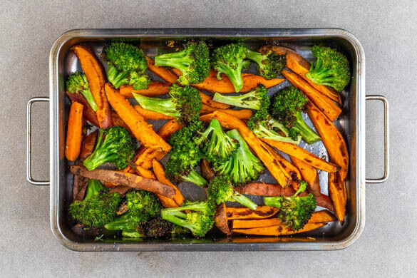 Den Brokkoli jeweils in mundgerechte Röschen schneiden, den Strunk ggf. schälen und grob würfeln. Den Brokkoli und die Süßkartoffeln mit 5EL Pflanzenöl und 1TL Salz vermengen und ca. 20Min. im Ofen rösten. Nach der Hälfte der Zeit wenden.