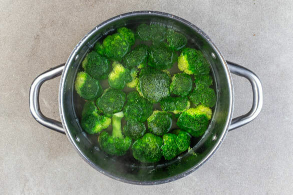 In dem Topf ausreichend leicht gesalzenes Wasser mit dem restlichen Brühgewürz für den Brokkoli zum Kochen bringen. Den Brokkoli in mundgerechte Röschen schneiden. 5Min. vor Ende der Backzeit den Brokkoli in die kochende Brühe geben und in 3–4Min. bissfest garen.