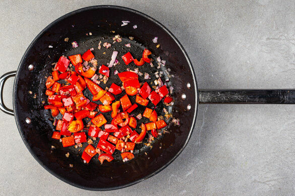 Die Zwiebelwürfel und die Paprika in einer mittelgroßen Pfanne mit 1EL Olivenöl und 1 Prise Salz bei mittlerer Hitze ca. 3Min. unter gelegentlichem Rühren anbraten, bis die Paprika etwas weicher ist. Aus der Pfanne nehmen und in einem hohen Gefäß beiseitestellen.