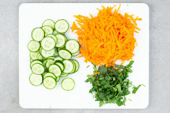 Die Karotten ggf. schälen und grob raspeln. Die Gurke in dünne Scheiben schneiden. Den Koriander ohne die härteren Stängel grob schneiden.