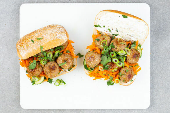 Vor langer Zeit brachten die Franzosen das Baguette in die damalige Kolonie Vietnam und schufen dort eine ganz neue Gattung von Gerichten: „Bánh Mì“. Wer jetzt in Vietnam danach fragt, bekommt ein gut gefülltes Sandwich mit komplexen Aromen und allen möglichen Zutaten wie Fleisch, Kräutern, Chili und Gemüse. Wir lieben unsere Variante mit Fleischbällchen und einer cremigen Limettenmayo. Dazu Babykartoffeln – köstlich!