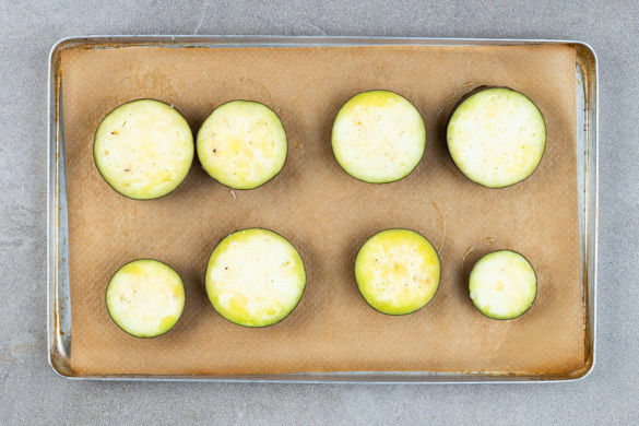 Den Backofen auf 210°C (190°C Umluft) vorheizen. Die Aubergine in ca. 1cm dicke Scheiben schneiden. Die Auberginenscheiben von beiden Seiten mit insgesamt 2EL Olivenöl sowie etwas Salz einreiben, auf einem mit Backpapier ausgelegten Backblech verteilen und ca. 20Min. backen, bis die Auberginen weich sind. Nach der Hälfte der Zeit einmal wenden.