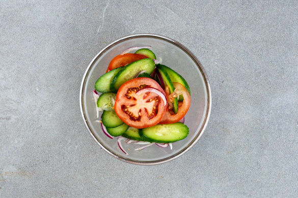 Die Zwiebel halbieren, eine Hälfte schälen und in feine Streifen schneiden. Die andere Hälfte wird für dieses Rezept nicht benötigt, wer mag, kann aber mehr Zwiebel an den Salat geben. Die Tomate und die Gurke in dünne Scheiben schneiden und mit den Zwiebeln, 1TL Olivenöl, 1TL Zitronensaft und ½TL Salz vermengen.