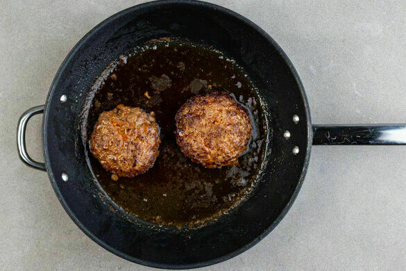 Die Pattys in einer großen Pfanne mit 2EL Olivenöl bei mittlerer bis starker Hitze auf jeder Seite ca. 3Min. braten, bis das Fleisch durch ist. Die Burgerbrötchen aufschneiden, die Hälften wieder aufeinanderlegen und im Ofen ca. 3Min. aufbacken.