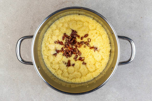 In einem mittelgroßen Topf 600ml Wasser mit dem ½ des Brühgewürzes zum Kochen bringen. Den Topf vom Herd nehmen, den Couscous und die Datteln in das kochende Wasser rühren und abgedeckt 6–8Min. quellen lassen.