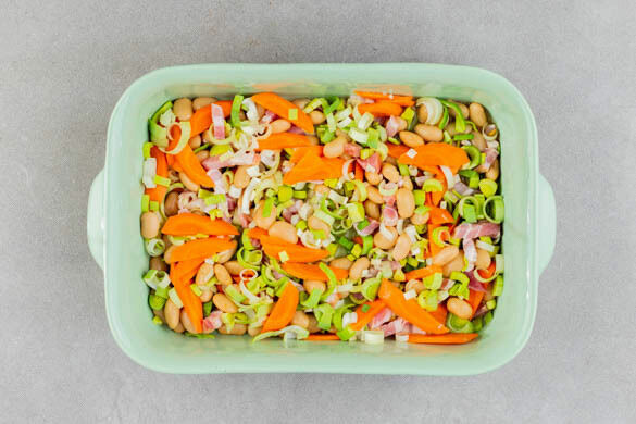 Die Bohnen in einer großen Auflaufform mit den Karotten, dem Lauch dem Knoblauch und dem Bacon vermengen, dann 100ml Wasser und die ½ des Brühgewürzes unterrühren.