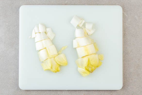 Den Chicorée längs halbieren und quer in ca. 2cm breite Streifen schneiden, dabei den Strunk entfernen.
